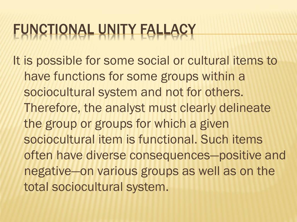 It is possible for some social or cultural items to have functions for some groups within a sociocultural system and not for others. Therefore, the analyst must clearly delineate the group or groups for which a given sociocultural item is functional. Such items often have diverse consequences—positive and negative—on various groups as well as on the total sociocultural system. Functional unity fallacy