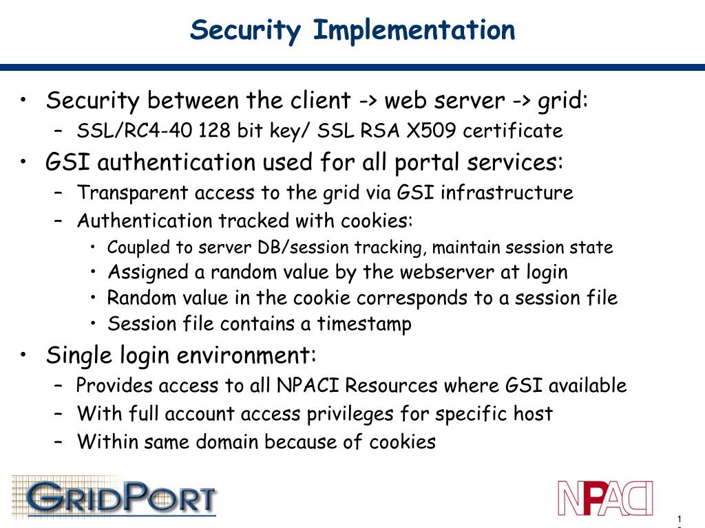 Security Implementation • Security between the client -> web server -> grid: • SSL/RC4-40 128 bit key/ SSL RSA X509 certificate • GSI authentication used for all portal services: • Transparent access to the grid via GSI infrastructure • Authentication tracked with cookies: • Coupled to server DB/session tracking, maintain session state • Assigned a random value by the webserver at login • Random value in the cookie corresponds to a session file • Session file contains a timestamp • Single login environment: • Provides access to all NPACI Resources where GSI available • With full account access privileges for specific host • Within same domain because of cookies