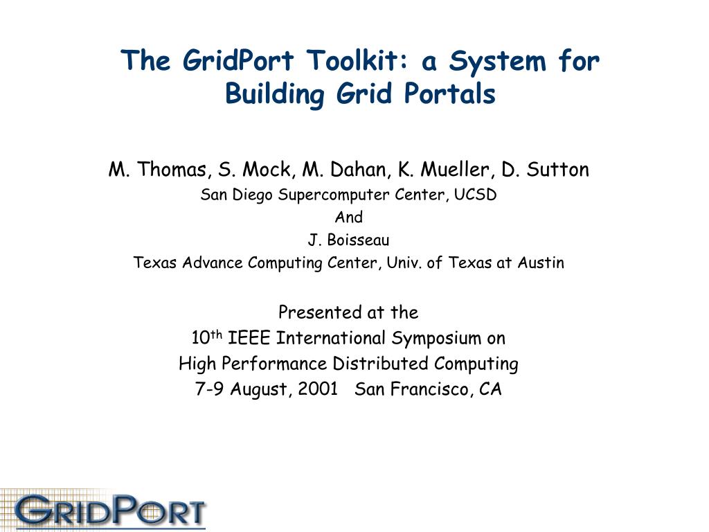 M. Thomas, S. Mock, M. Dahan, K. Mueller, D. Sutton San Diego Supercomputer Center, UCSD And J. Boisseau Texas Advance Computing Center, Univ. of Texas at Austin Presented at the 10th IEEE International Symposium on High Performance Distributed Computing 7-9 August, 2001 San Francisco, CA The GridPort Toolkit: a System for Building Grid Portals