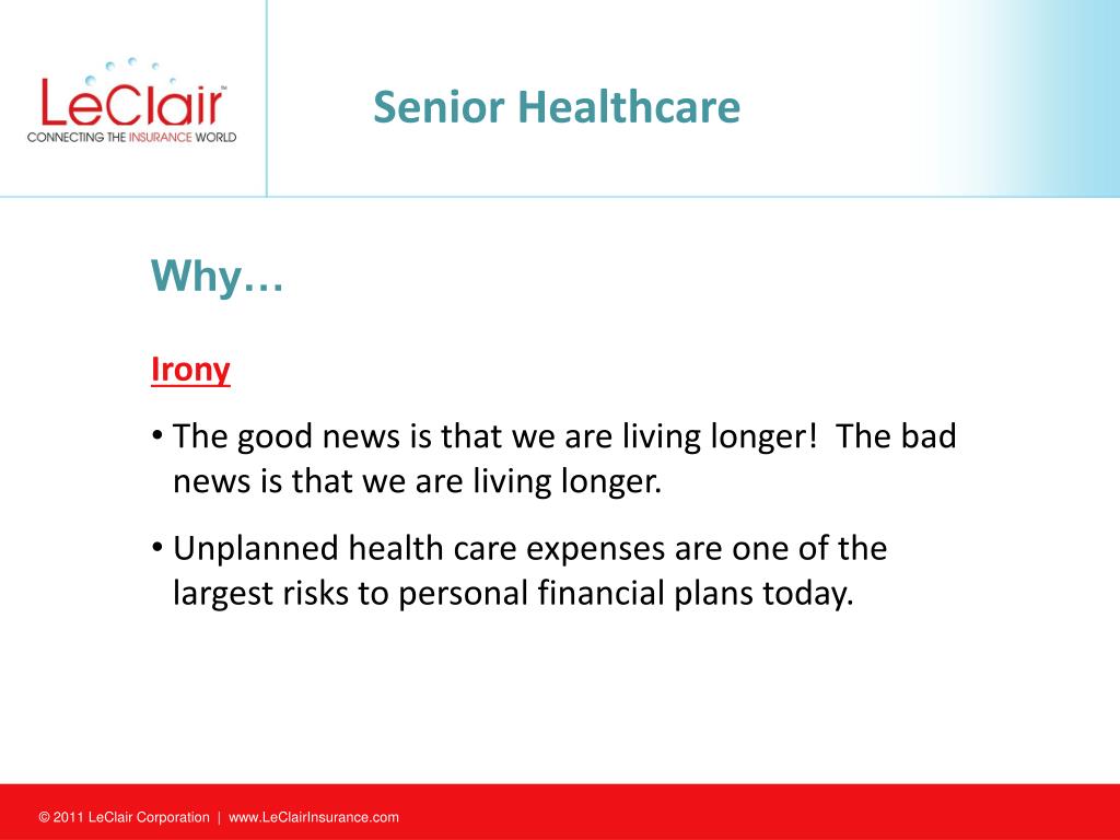 Senior Healthcare • Why… • Irony • The good news is that we are living longer! The bad news is that we are living longer. • Unplanned health care expenses are one of the largest risks to personal financial plans today.
