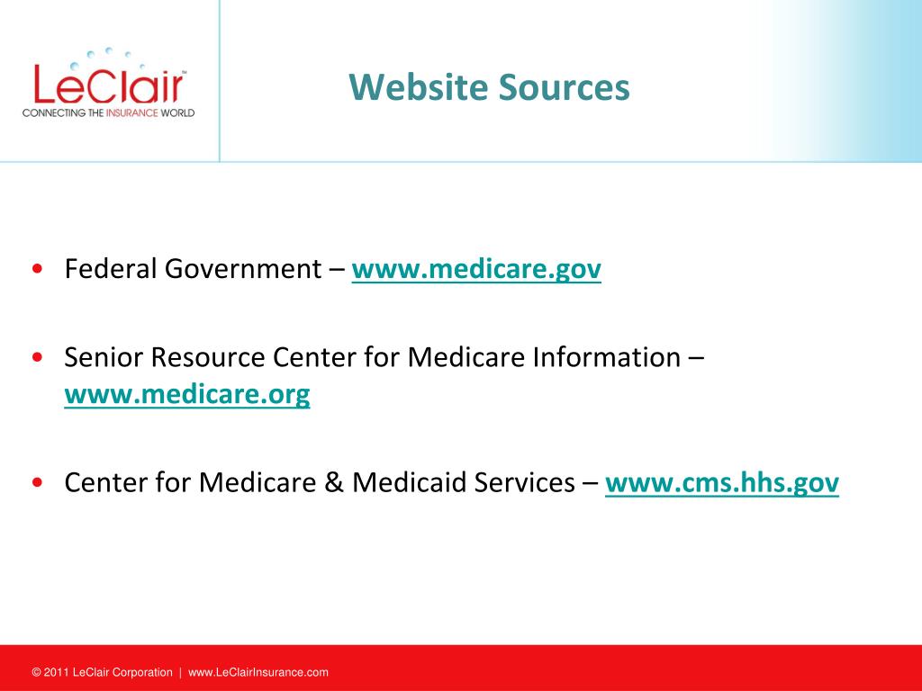 Website Sources • Federal Government –www.medicare.gov • Senior Resource Center for Medicare Information –www.medicare.org • Center for Medicare & Medicaid Services –www.cms.hhs.gov