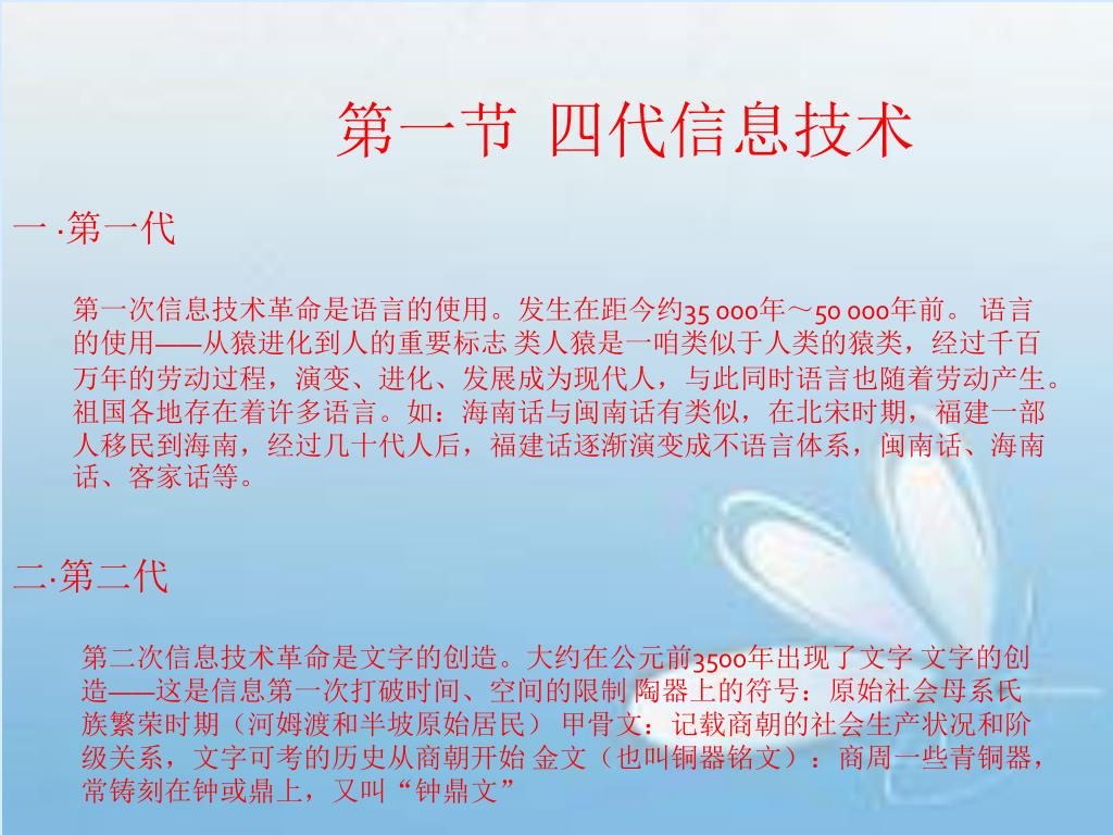 第一节 四代信息技术 一 ·第一代 第一次信息技术革命是语言的使用。发生在距今约35 000年~50 000年前。 语言的使用——从猿进化到人的重要标志 类人猿是一咱类似于人类的猿类,经过千百万年的劳动过程,演变、进化、发展成为现代人,与此同时语言也随着劳动产生。祖国各地存在着许多语言。如:海南话与闽南话有类似,在北宋时期,福建一部人移民到海南,经过几十代人后,福建话逐渐演变成不语言体系,闽南话、海南话、客家话等。 二·第二代 第二次信息技术革命是文字的创造。大约在公元前3500年出现了文字 文字的创造——这是信息第一次打破时间、空间的限制 陶器上的符号:原始社会母系氏族繁荣时期(河姆渡和半坡原始居民) 甲骨文:记载商朝的社会生产状况和阶级关系,文字可考的历史从商朝开始 金文(也叫铜器铭文):商周一些青铜器,常铸刻在钟或鼎上,又叫“钟鼎文”