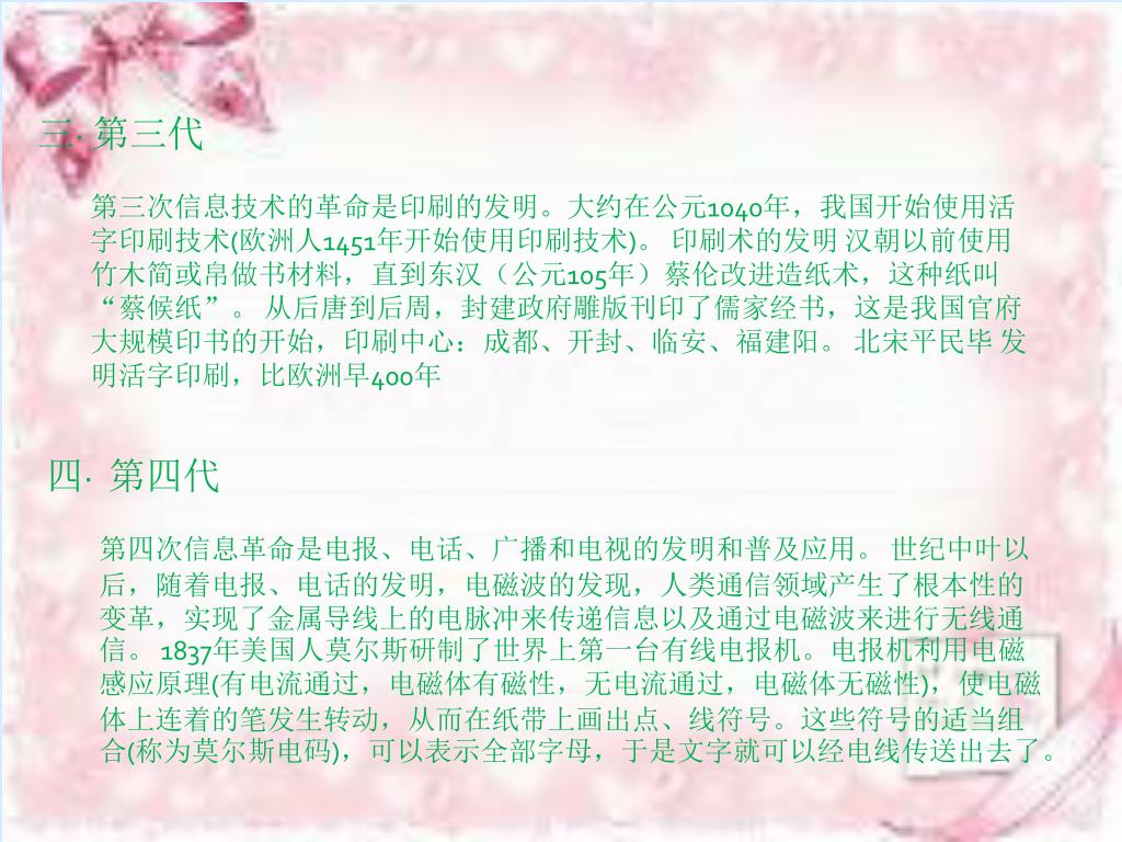 三· 第三代 第三次信息技术的革命是印刷的发明。大约在公元1040年,我国开始使用活字印刷技术(欧洲人1451年开始使用印刷技术)。 印刷术的发明 汉朝以前使用竹木简或帛做书材料,直到东汉(公元105年)蔡伦改进造纸术,这种纸叫“蔡候纸”。 从后唐到后周,封建政府雕版刊印了儒家经书,这是我国官府大规模印书的开始,印刷中心:成都、开封、临安、福建阳。 北宋平民毕 发明活字印刷,比欧洲早400年 四· 第四代 第四次信息革命是电报、电话、广播和电视的发明和普及应用。 世纪中叶以后,随着电报、电话的发明,电磁波的发现,人类通信领域产生了根本性的变革,实现了金属导线上的电脉冲来传递信息以及通过电磁波来进行无线通信。 1837年美国人莫尔斯研制了世界上第一台有线电报机。电报机利用电磁感应原理(有电流通过,电磁体有磁性,无电流通过,电磁体无磁性),使电磁体上连着的笔发生转动,从而在纸带上画出点、线符号。这些符号的适当组合(称为莫尔斯电码),可以表示全部字母,于是文字就可以经电线传送出去了。