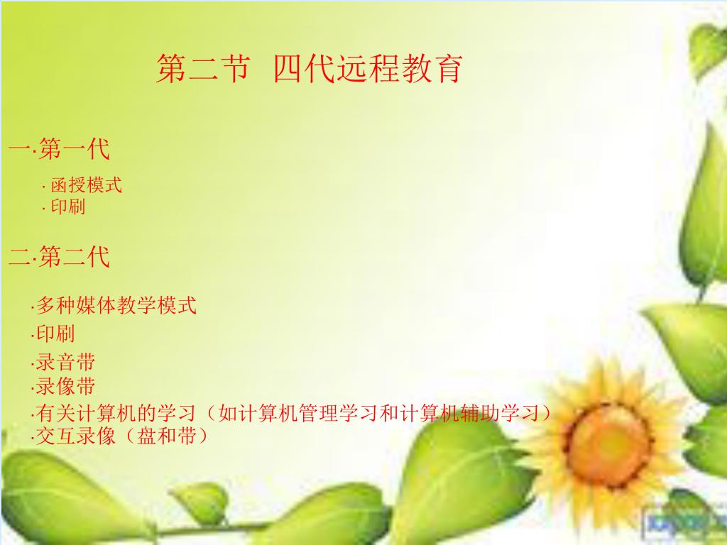 第二节 四代远程教育 一·第一代 · 函授模式 · 印刷 二·第二代 ·多种媒体教学模式 ·印刷 ·录音带·录像带 ·有关计算机的学习(如计算机管理学习和计算机辅助学习) ·交互录像(盘和带)