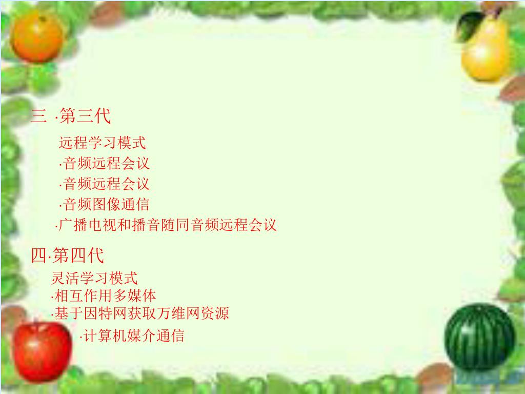三 ·第三代 远程学习模式 ·音频远程会议 ·音频远程会议 ·音频图像通信 ·广播电视和播音随同音频远程会议 四·第四代 灵活学习模式·相互作用多媒体·基于因特网获取万维网资源 ·计算机媒介通信