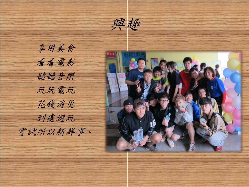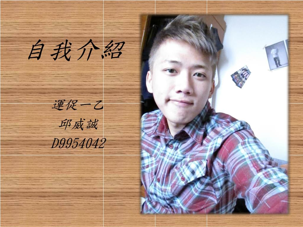 自我介紹. 運促一乙 邱威誠 D9954042. 請你認識我 …. 笑帥 : 邱威誠 生日 :1992-3-19 星座 / 生肖 : 雙魚 / 猴 身高 / 體重 : 173/75 血型 : 廉價的 O 型. 我是誰 ??. 我是邱威誠 , 生在台中住在大雅,個性活潑開朗是個好動的大男孩,喜歡到遊玩毫無拘束,過著平凡的生活,我的人生不外乎就是簡單。. 學歷. 大智國學 東 峰國中 慈 明高級中學 中州技術學院. 興趣. 享用美食 看看電影 聽聽音樂 玩玩 電玩 花錢 消災 到處遊玩 嘗試所以新鮮事。. 未來. 拿著單眼相機到處拍 …