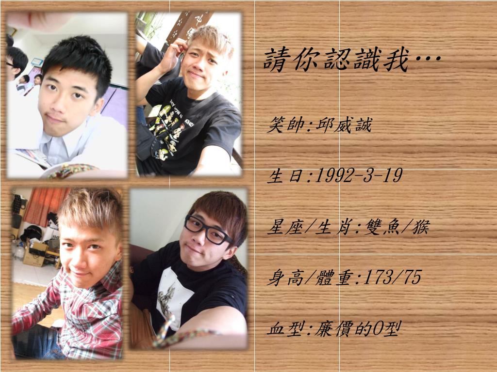 請你認識我… 笑帥:邱威誠 生日:1992-3-19 星座/生肖:雙魚/猴 身高/體重:173/75 血型:廉價的O型