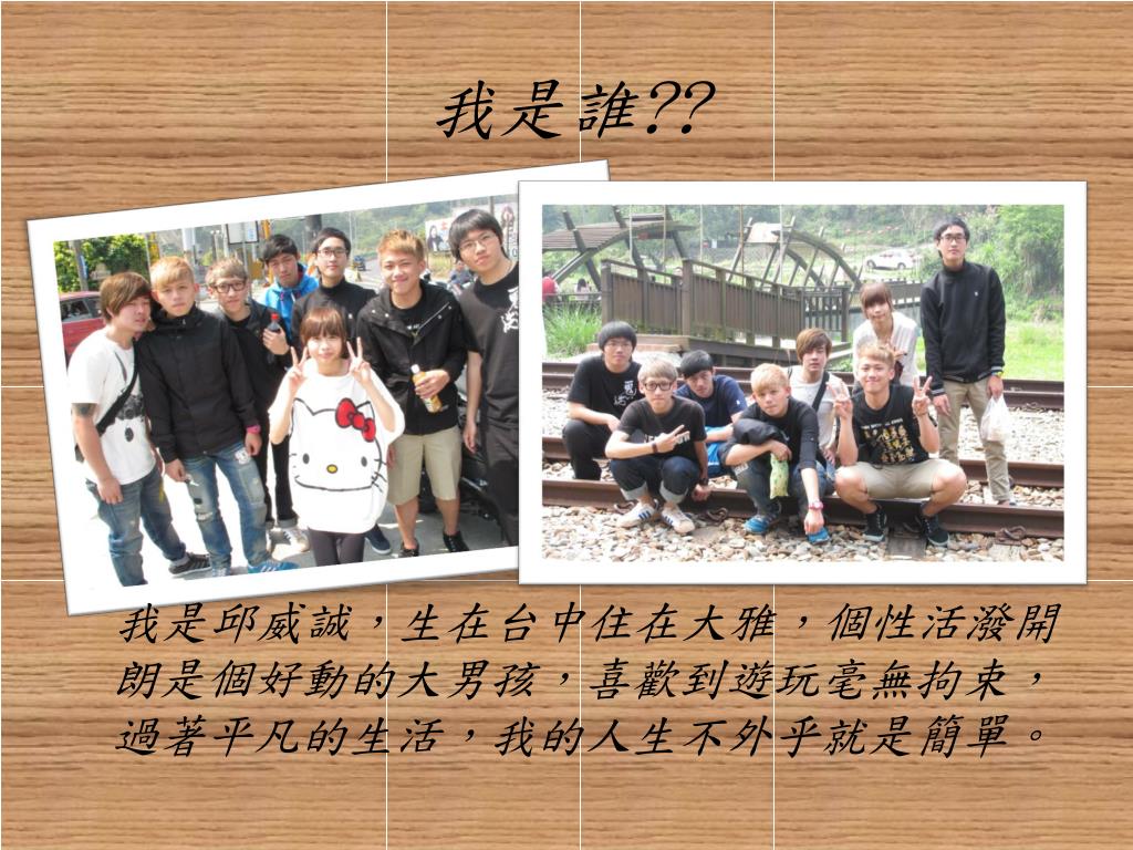 我是誰?? 我是邱威誠,生在台中住在大雅,個性活潑開朗是個好動的大男孩,喜歡到遊玩毫無拘束,過著平凡的生活,我的人生不外乎就是簡單。