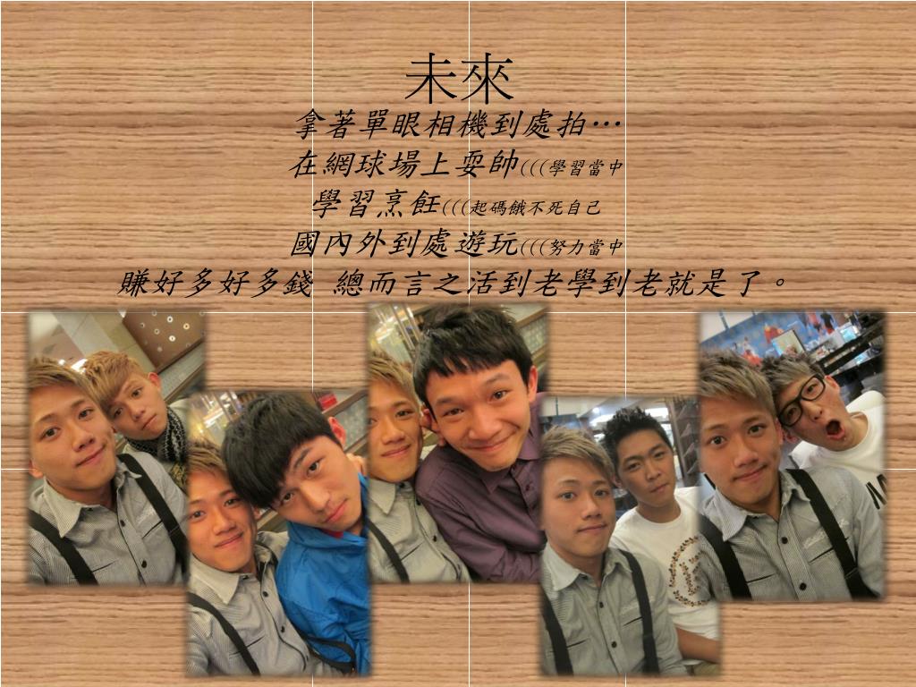 未來 拿著單眼相機到處拍… 在網球場上耍帥(((學習當中 學習烹飪(((起碼餓不死自己 國內外到處遊玩(((努力當中 賺好多好多錢總而言之活到老學到老就是了。