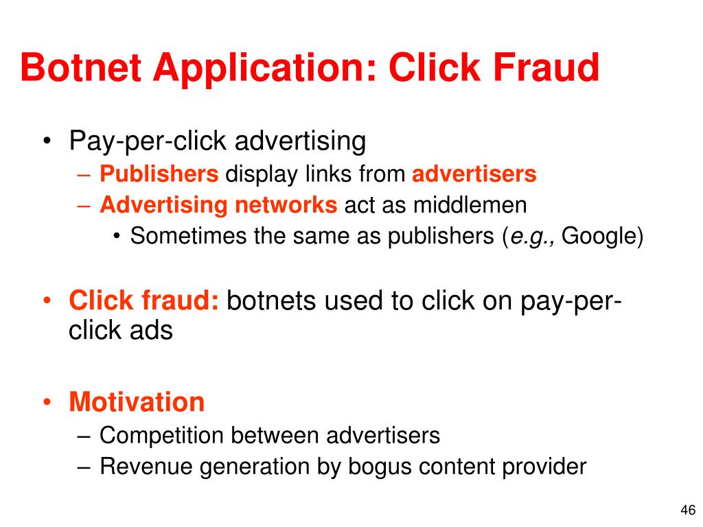 Botnet Application: Click Fraud • Pay-per-click advertising • Publishers display links from advertisers • Advertising networks act as middlemen • Sometimes the same as publishers (e.g., Google) • Click fraud:botnets used to click on pay-per-click ads • Motivation • Competition between advertisers • Revenue generation by bogus content provider
