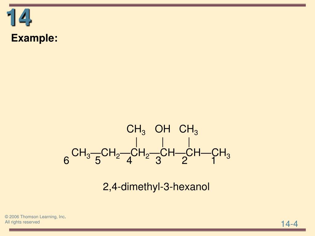 CH3 | OH | CH3 | Example: CH3—CH2—CH2—CH—CH—CH3 6 5 4 3 2 1 2,4-dimethyl-3-hexanol