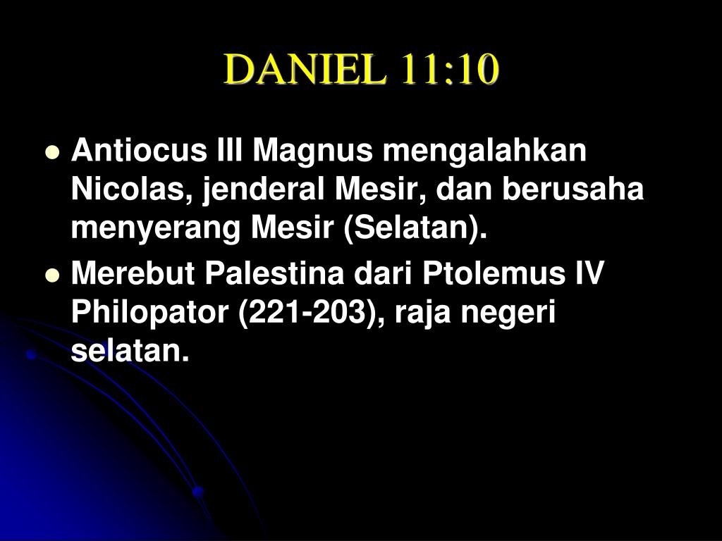 DANIEL 11:10 • Antiocus III Magnus mengalahkan Nicolas, jenderal Mesir, dan berusaha menyerang Mesir (Selatan). • Merebut Palestina dari Ptolemus IV Philopator (221-203), raja negeri selatan.