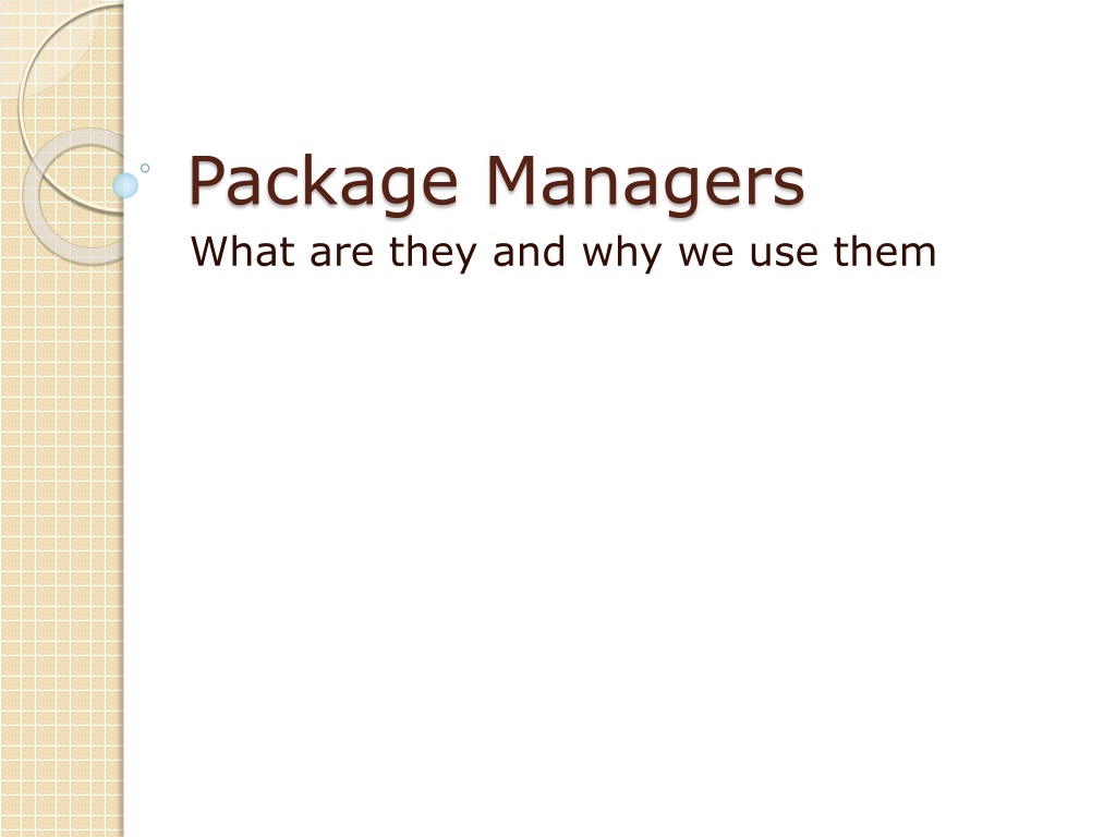 Package ManagersHigh Level • Fetch from remote repositories • Search • Install additional packages to meet dependencies • Handle complex upgrades