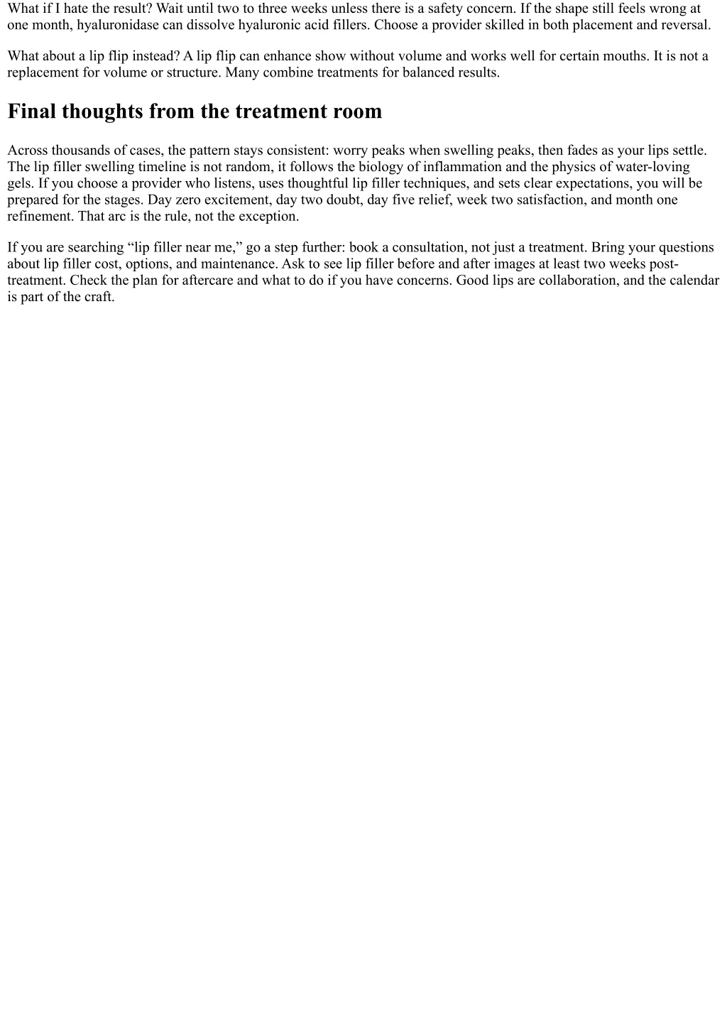 What if I hate the result? Wait until two to three weeks unless there is a safety concern. If the shape still feels wrong at one month, hyaluronidase can dissolve hyaluronic acid fillers. Choose a provider skilled in both placement and reversal. What about a lip flip instead? A lip flip can enhance show without volume and works well for certain mouths. It is not a replacement for volume or structure. Many combine treatments for balanced results. Final thoughts from the treatment room Across thousands of cases, the pattern stays consistent: worry peaks when swelling peaks, then fades as your lips settle. The lip filler swelling timeline is not random, it follows the biology of inflammation and the physics of water-loving gels. If you choose a provider who listens, uses thoughtful lip filler techniques, and sets clear expectations, you will be prepared for the stages. Day zero excitement, day two doubt, day five relief, week two satisfaction, and month one refinement. That arc is the rule, not the exception. If you are searching “lip filler near me,” go a step further: book a consultation, not just a treatment. Bring your questions about lip filler cost, options, and maintenance. Ask to see lip filler before and after images at least two weeks post- treatment. Check the plan for aftercare and what to do if you have concerns. Good lips are collaboration, and the calendar is part of the craft.