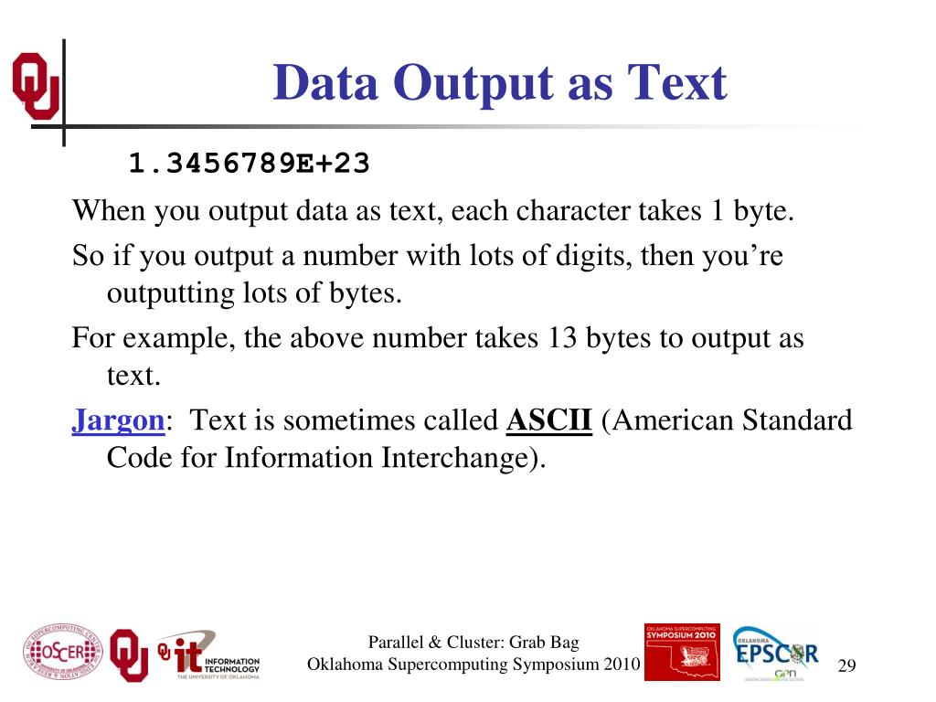 Data Output as Text 1.3456789E+23 When you output data as text, each character takes 1 byte. So if you output a number with lots of digits, then you’re outputting lots of bytes. For example, the above number takes 13 bytes to output as text. Jargon: Text is sometimes called ASCII (American Standard Code for Information Interchange). Parallel & Cluster: Grab Bag Oklahoma Supercomputing Symposium 2010