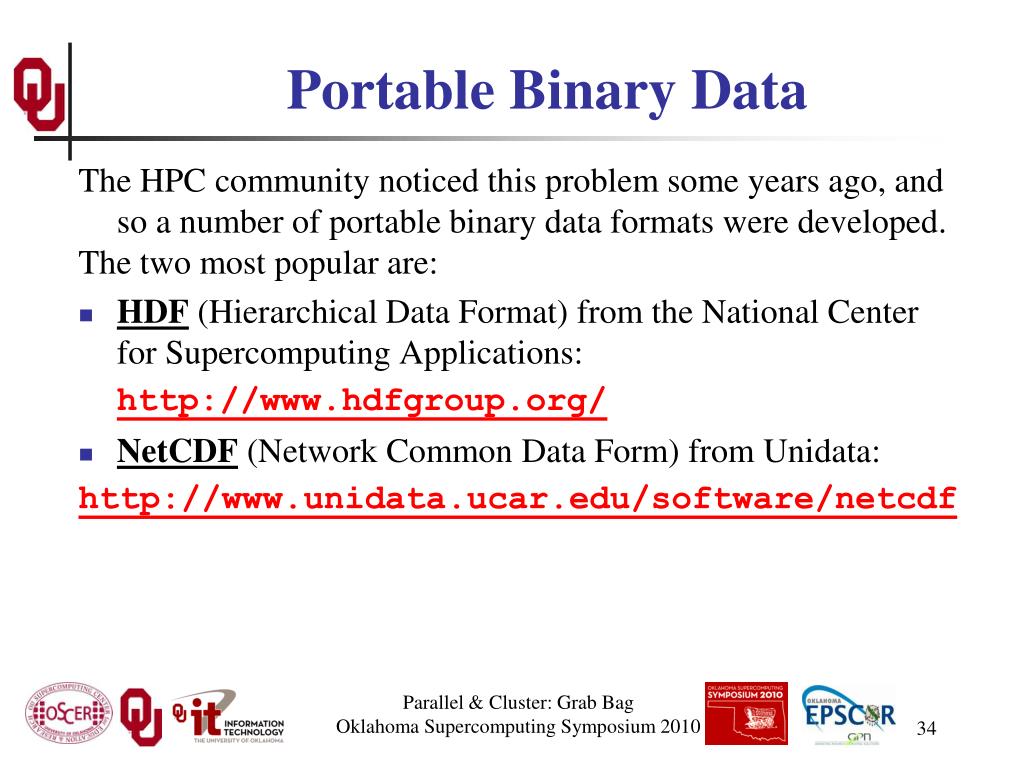 Portable Binary Data The HPC community noticed this problem some years ago, and so a number of portable binary data formats were developed. The two most popular are: • HDF (Hierarchical Data Format) from the National Center for Supercomputing Applications: http://www.hdfgroup.org/ • NetCDF (Network Common Data Form) from Unidata: http://www.unidata.ucar.edu/software/netcdf Parallel & Cluster: Grab Bag Oklahoma Supercomputing Symposium 2010