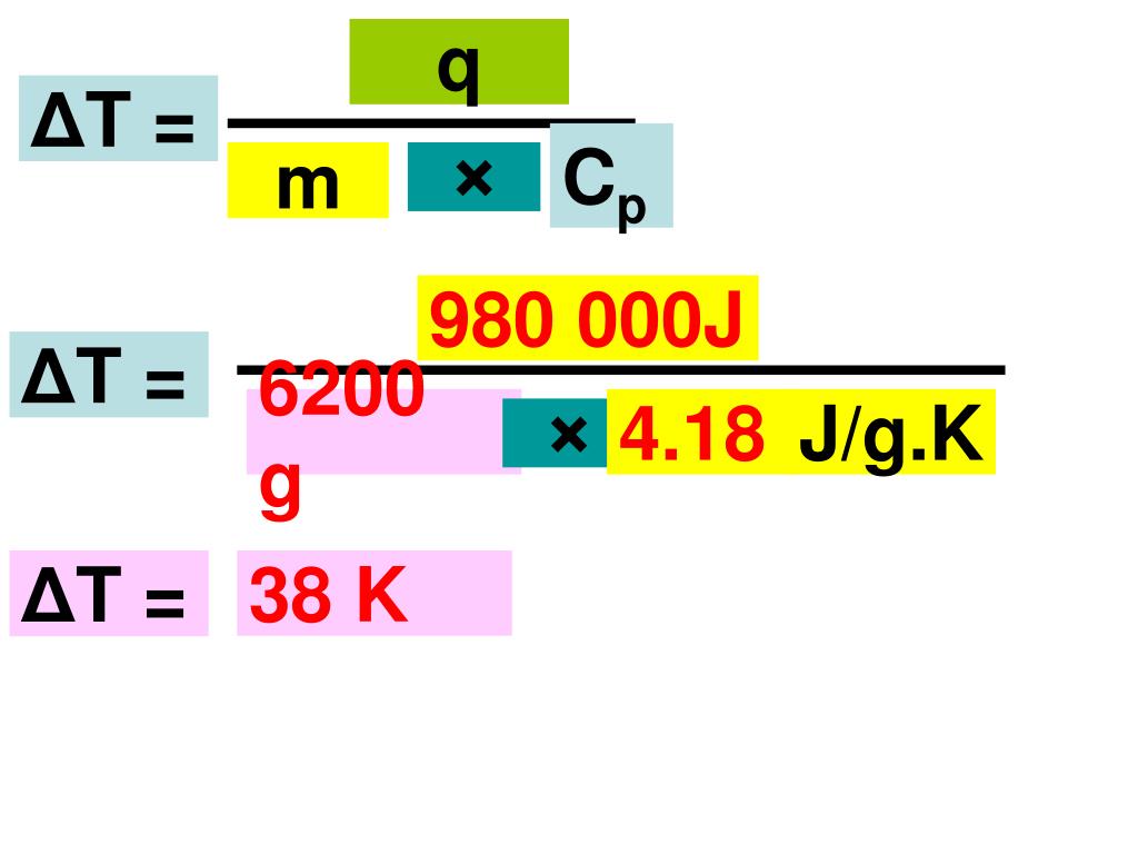 q ΔT = Cp m × 980 000J ΔT = 6200 g 4.18 J/g.K × ΔT = 38 K