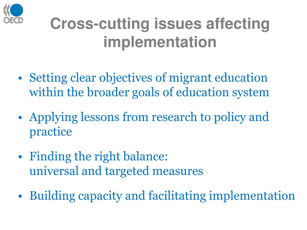 Cross-cutting issues affecting implementation • Setting clear objectives of migrant education within the broader goals of education system • Applying lessons from research to policy and practice • Finding the right balance: universal and targeted measures • Building capacity and facilitating implementation