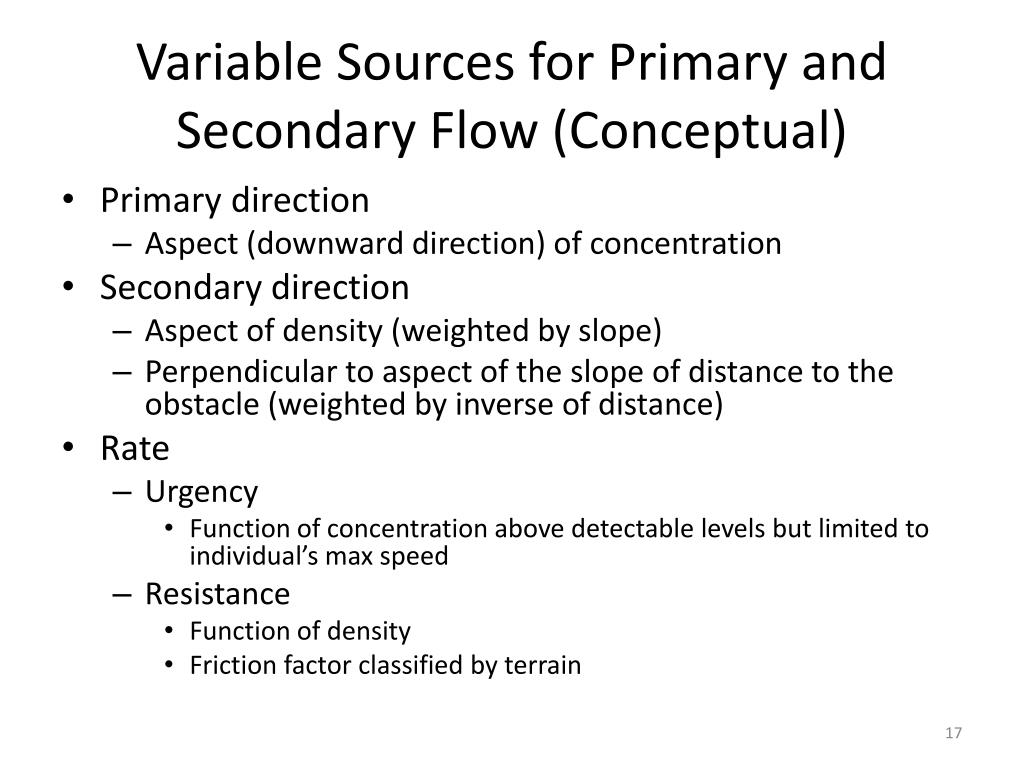 Variable Sources for Primary and Secondary Flow (Conceptual) • Primary direction • Aspect (downward direction) of concentration • Secondary direction • Aspect of density (weighted by slope) • Perpendicular to aspect of the slope of distance to the obstacle (weighted by inverse of distance) • Rate • Urgency • Function of concentration above detectable levels but limited to individual’s max speed • Resistance • Function of density • Friction factor classified by terrain