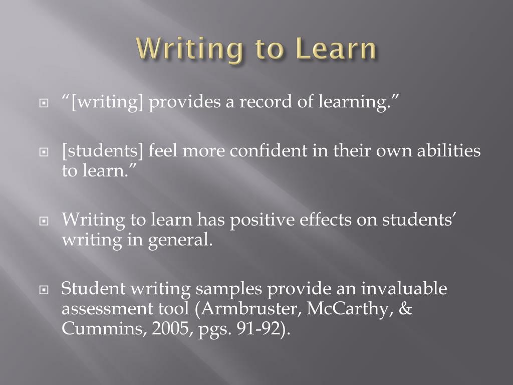 Writing to Learn • “[writing] provides a record of learning.” • [students] feel more confident in their own abilities to learn.” • Writing to learn has positive effects on students’ writing in general. • Student writing samples provide an invaluable assessment tool (Armbruster, McCarthy, & Cummins, 2005, pgs. 91-92).