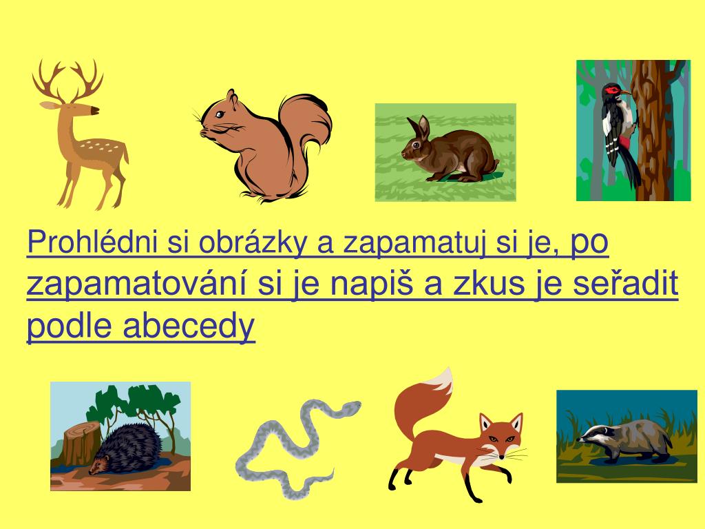 INTEGRACE. 2.ročník. ČJ. Prohlédni si obrázky a zapamatuj si je, po zapamatování si je napiš a zkus je seřadit podle abecedy. Kontrola:. jelen, veverka, zajíc, datel ježek, zmije, liška, jezevec. Slova seřazená podle abecedy:. datel jelen jezevec ježek. 5. liška 6. veverka