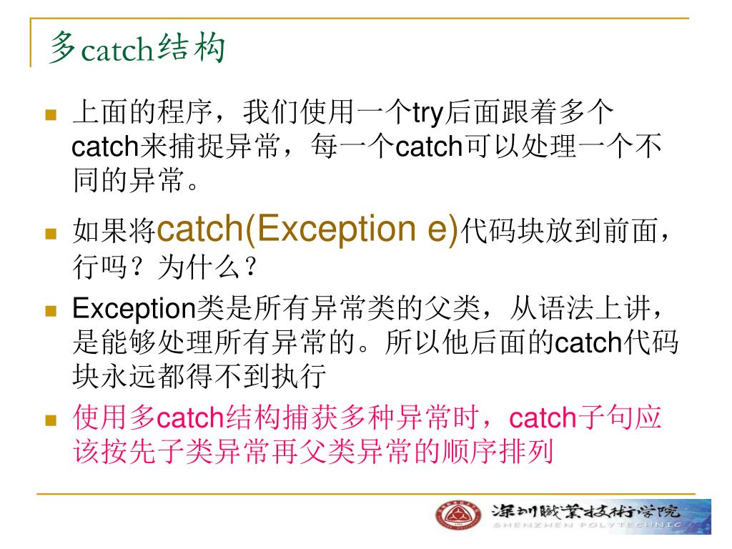 多catch结构 • 上面的程序,我们使用一个try后面跟着多个catch来捕捉异常,每一个catch可以处理一个不同的异常。 • 如果将catch(Exception e)代码块放到前面,行吗?为什么? • Exception类是所有异常类的父类,从语法上讲,是能够处理所有异常的。所以他后面的catch代码块永远都得不到执行 • 使用多catch结构捕获多种异常时,catch子句应该按先子类异常再父类异常的顺序排列