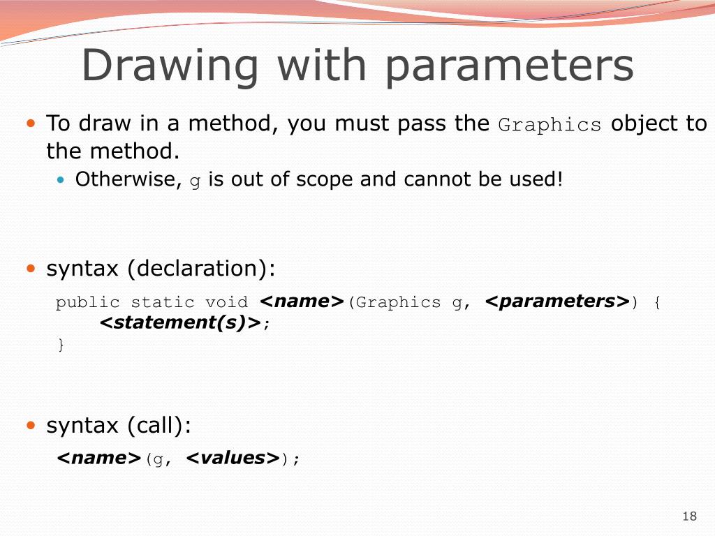Drawing with parameters • To draw in a method, you must pass the Graphics object to the method. • Otherwise, g is out of scope and cannot be used! • syntax (declaration): public static void <name>(Graphics g, <parameters>) { <statement(s)>; } • syntax (call): <name>(g, <values>);