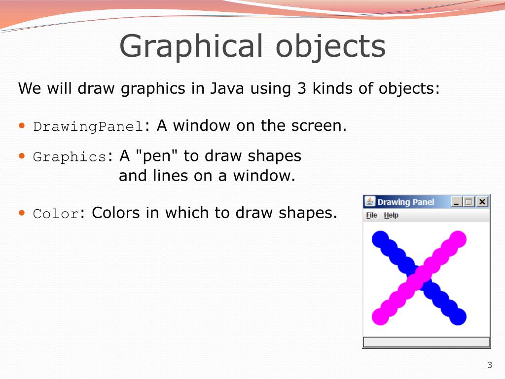 Graphical objects We will draw graphics in Java using 3 kinds of objects: • DrawingPanel: A window on the screen. • Graphics: A "pen" to draw shapes and lines on a window. • Color: Colors in which to draw shapes.