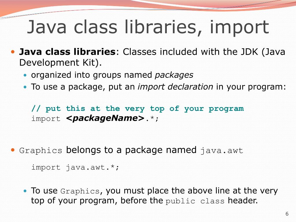Java class libraries, import • Java class libraries: Classes included with the JDK (Java Development Kit). • organized into groups named packages • To use a package, put an import declaration in your program: // put this at the very top of your program import <packageName>.*; • Graphics belongs to a package named java.awt import java.awt.*; • To use Graphics, you must place the above line at the very top of your program, before the public class header.
