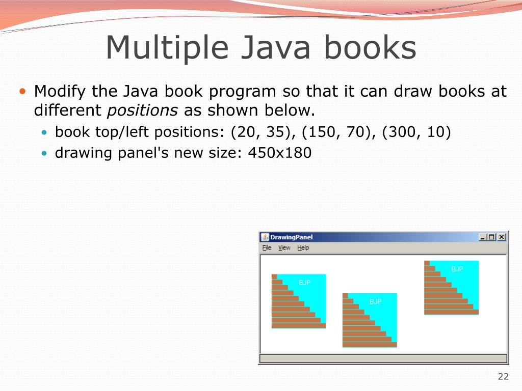 Multiple Java books • Modify the Java book program so that it can draw books at different positions as shown below. • book top/left positions: (20, 35), (150, 70), (300, 10) • drawing panel's new size: 450x180