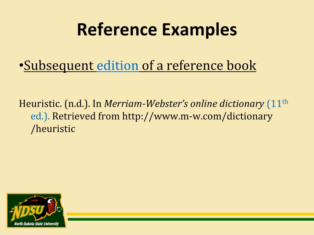 Reference Examples Subsequent edition of a reference book Heuristic. (n.d.). In Merriam-Webster’s online dictionary (11th ed.).Retrieved from http://www.m-w.com/dictionary /heuristic