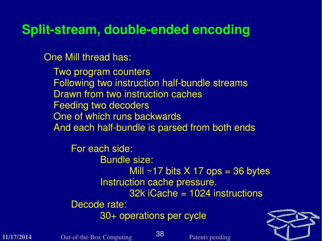 Split-stream, double-ended encoding One Mill thread has: Two program counters Following two instruction half-bundle streams Drawn from two instruction caches Feeding two decoders One of which runs backwards And each half-bundle is parsed from both ends For each side: Bundle size: Mill ~17 bits X 17 ops = 36 bytes Instruction cache pressure. 32k iCache = 1024 instructions Decode rate: 30+ operations per cycle