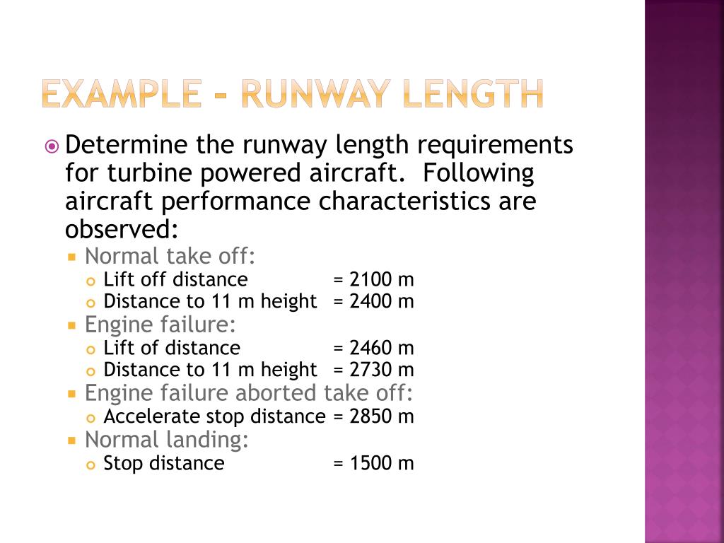 Example – Runway Length • Determine the runway length requirements for turbine powered aircraft. Following aircraft performance characteristics are observed: • Normal take off: • Lift off distance = 2100 m • Distance to 11 m height = 2400 m • Engine failure: • Lift of distance = 2460 m • Distance to 11 m height = 2730 m • Engine failure aborted take off: • Accelerate stop distance = 2850 m • Normal landing: • Stop distance = 1500 m