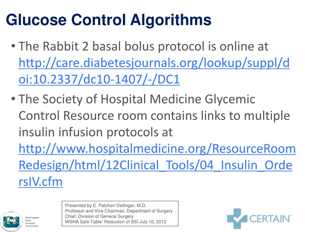 Glucose Control Algorithms Presented by E. Patchen Dellinger, M.D.Professor and Vice Chairman, Department of SurgeryChief, Division of General SurgeryWSHA Safe Table: Reduction of SSI July 10, 2012 The Rabbit 2 basal bolus protocol is online at http://care.diabetesjournals.org/lookup/suppl/doi:10.2337/dc10-1407/-/DC1 The Society of Hospital Medicine Glycemic Control Resource room contains links to multiple insulin infusion protocols at http://www.hospitalmedicine.org/ResourceRoomRedesign/html/12Clinical_Tools/04_Insulin_OrdersIV.cfm
