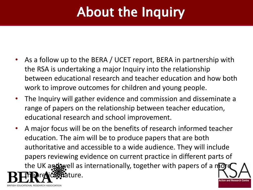 About the Inquiry • As a follow up to the BERA / UCET report, BERA in partnership with the RSA is undertaking a major Inquiry into the relationship between educational research and teacher education and how both work to improve outcomes for children and young people. • The Inquiry will gather evidence and commission and disseminate a range of papers on the relationship between teacher education, educational research and school improvement. • A major focus will be on the benefits of research informed teacher education. The aim will be to produce papers that are both authoritative and accessible to a wide audience. They will include papers reviewing evidence on current practice in different parts of the UK and well as internationally, together with papers of a more theoretical nature.