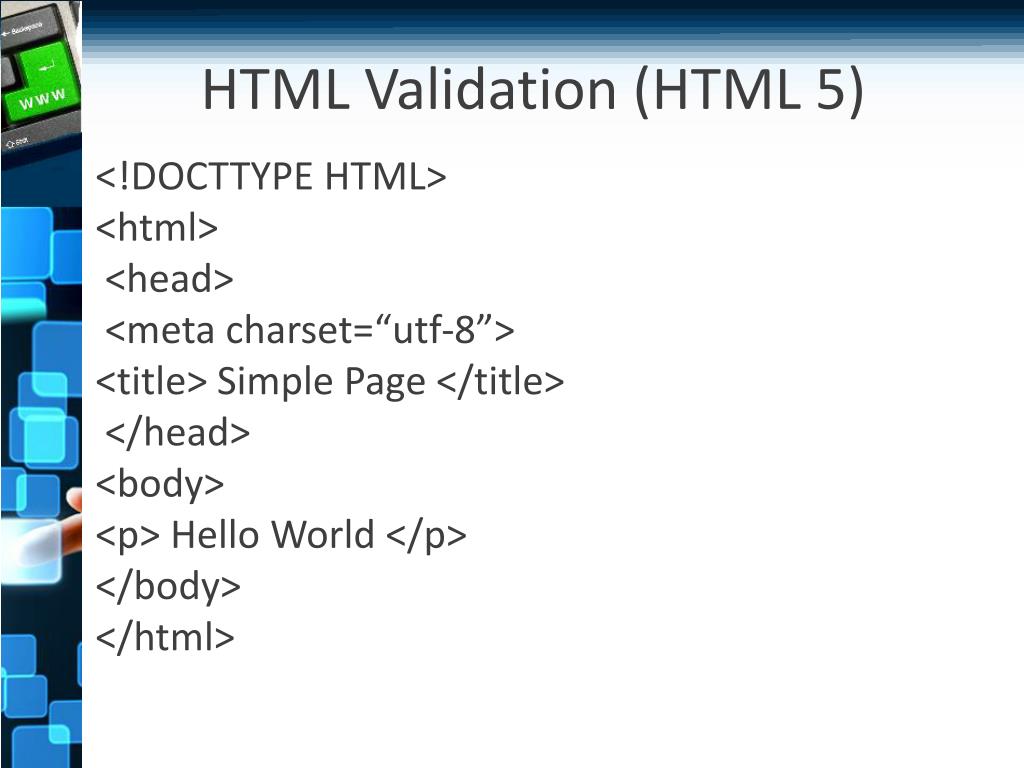 HTML Validation (HTML 5) <!DOCTTYPE HTML> <html> <head> <meta charset=“utf-8”> <title> Simple Page </title> </head> <body> <p> Hello World </p> </body> </html>