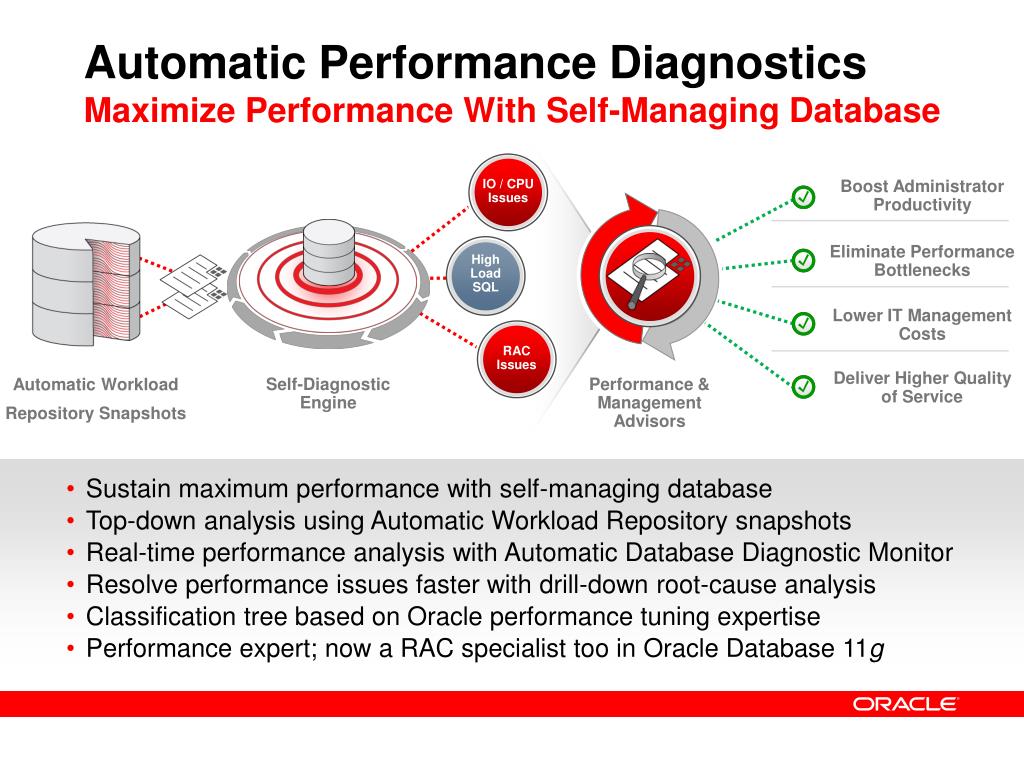 Automatic Performance DiagnosticsMaximize Performance With Self-Managing Database HighLoadSQL Boost Administrator Productivity Eliminate Performance Bottlenecks Lower IT Management Costs RACIssues IO / CPUIssues Deliver Higher Quality of Service Self-Diagnostic Engine Performance & Management Advisors Automatic Workload Repository Snapshots • Sustain maximum performance with self-managing database • Top-down analysis using Automatic Workload Repository snapshots • Real-time performance analysis with Automatic Database Diagnostic Monitor • Resolve performance issues faster with drill-down root-cause analysis • Classification tree based on Oracle performance tuning expertise • Performance expert; now a RAC specialist too in Oracle Database 11g