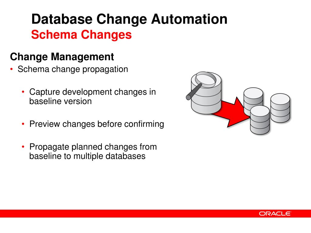 Database Change AutomationSchema Changes Change Management • Schema change propagation • Capture development changes in baseline version • Preview changes before confirming • Propagate planned changes from baseline to multiple databases