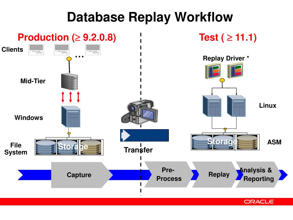 Production ( 9.2.0.8) Test ( 11.1) Clients … Replay Driver * Mid-Tier Linux … Windows Storage ASM File System Storage Transfer Replay Analysis & Reporting Capture Database Replay Workflow Pre- Process