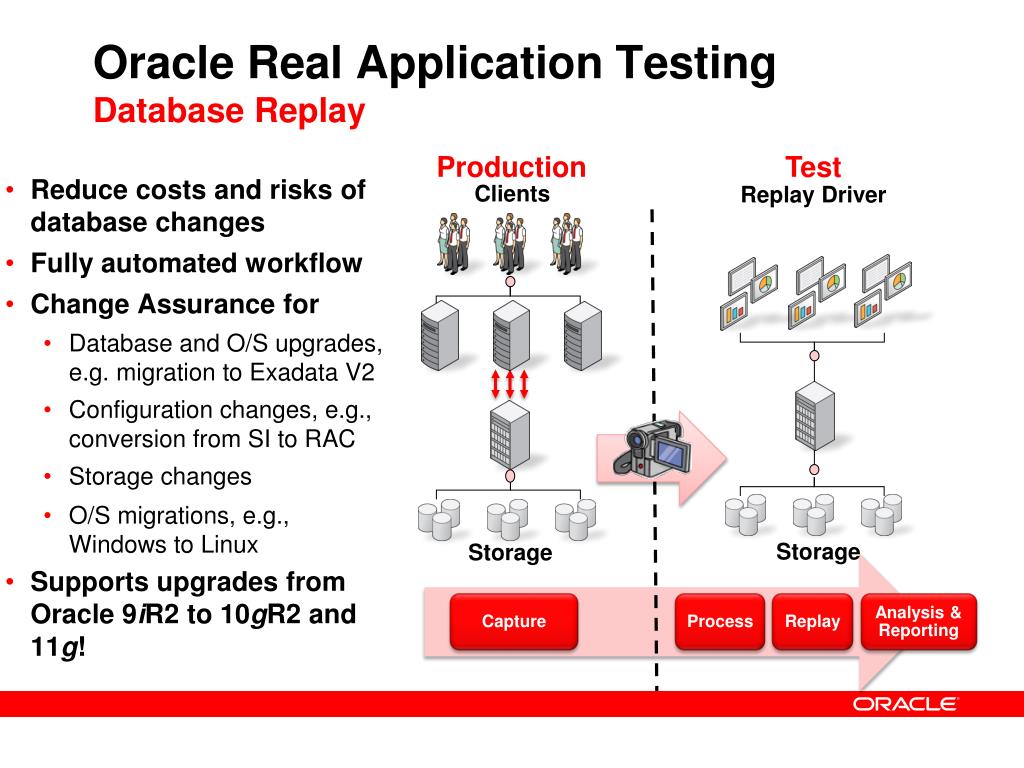 Oracle Real Application Testing Database Replay Production Test Clients Replay Driver • Reduce costs and risks of database changes • Fully automated workflow • Change Assurance for • Database and O/S upgrades, e.g. migration to Exadata V2 • Configuration changes, e.g., conversion from SI to RAC • Storage changes • O/S migrations, e.g., Windows to Linux • Supports upgrades from Oracle 9iR2 to 10gR2 and 11g! Storage Storage
