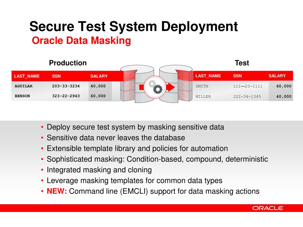 Secure Test System Deployment Oracle Data Masking Production Test • Deploy secure test system by masking sensitive data • Sensitive data never leaves the database • Extensible template library and policies for automation • Sophisticated masking: Condition-based, compound, deterministic • Integrated masking and cloning • Leverage masking templates for common data types • NEW: Command line (EMCLI) support for data masking actions