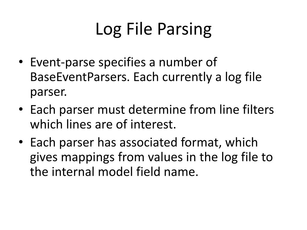Log File Parsing • Event-parse specifies a number of BaseEventParsers. Each currently a log file parser. • Each parser must determine from line filters which lines are of interest. • Each parser has associated format, which gives mappings from values in the log file to the internal model field name.