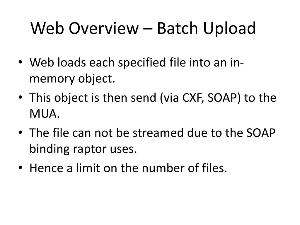 Web Overview – Batch Upload • Web loads each specified file into an in-memory object. • This object is then send (via CXF, SOAP) to the MUA. • The file can not be streamed due to the SOAP binding raptor uses. • Hence a limit on the number of files.