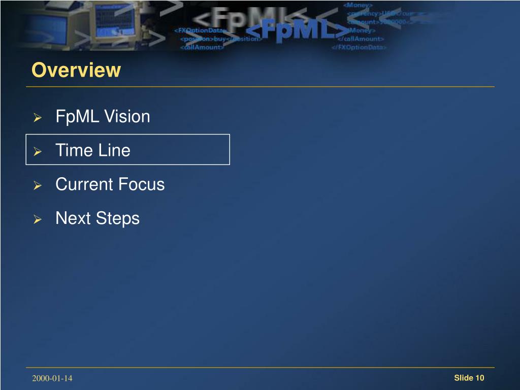 Financial Products Markup Language. Introduction to FpML Brian Lynn, J.P. Morgan www.fpml.org 2000-01-14. Overview. FpML Vision Time Line Current Focus Next Steps. Overview. FpML Vision Time Line Current Focus Next Steps. The FpML Vision. Enable e-commerce for financial derivatives