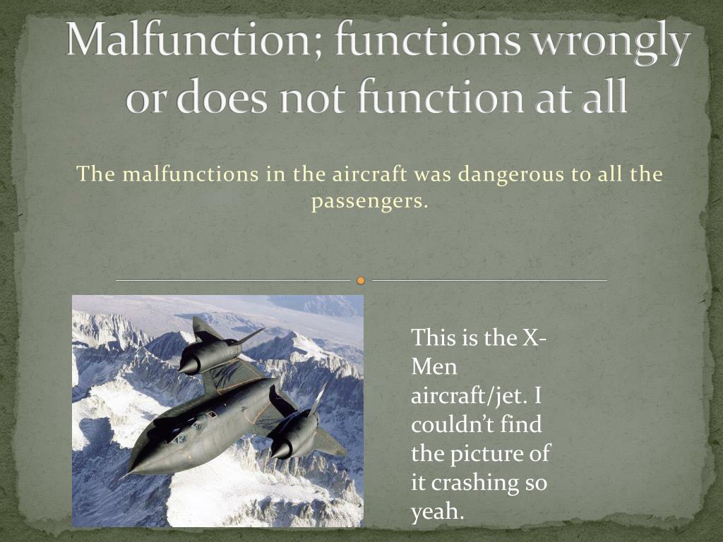 Malfunction; functions wrongly or does not function at all The malfunctions in the aircraft was dangerous to all the passengers. This is the X-Men aircraft/jet. I couldn’t find the picture of it crashing so yeah.