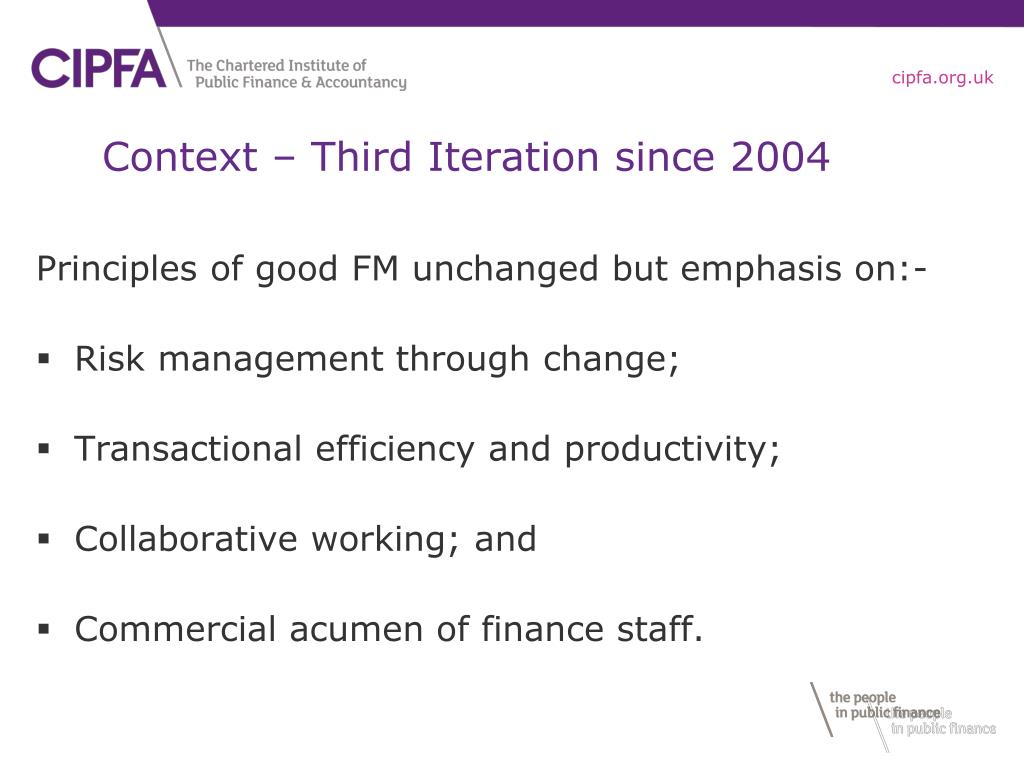 Context – Third Iteration since 2004 Principles of good FM unchanged but emphasis on:- • Risk management through change; • Transactional efficiency and productivity; • Collaborative working; and • Commercial acumen of finance staff.