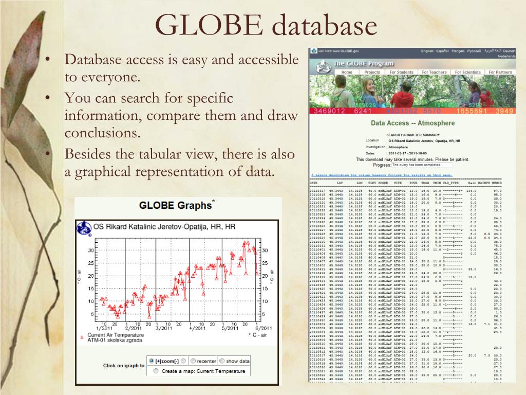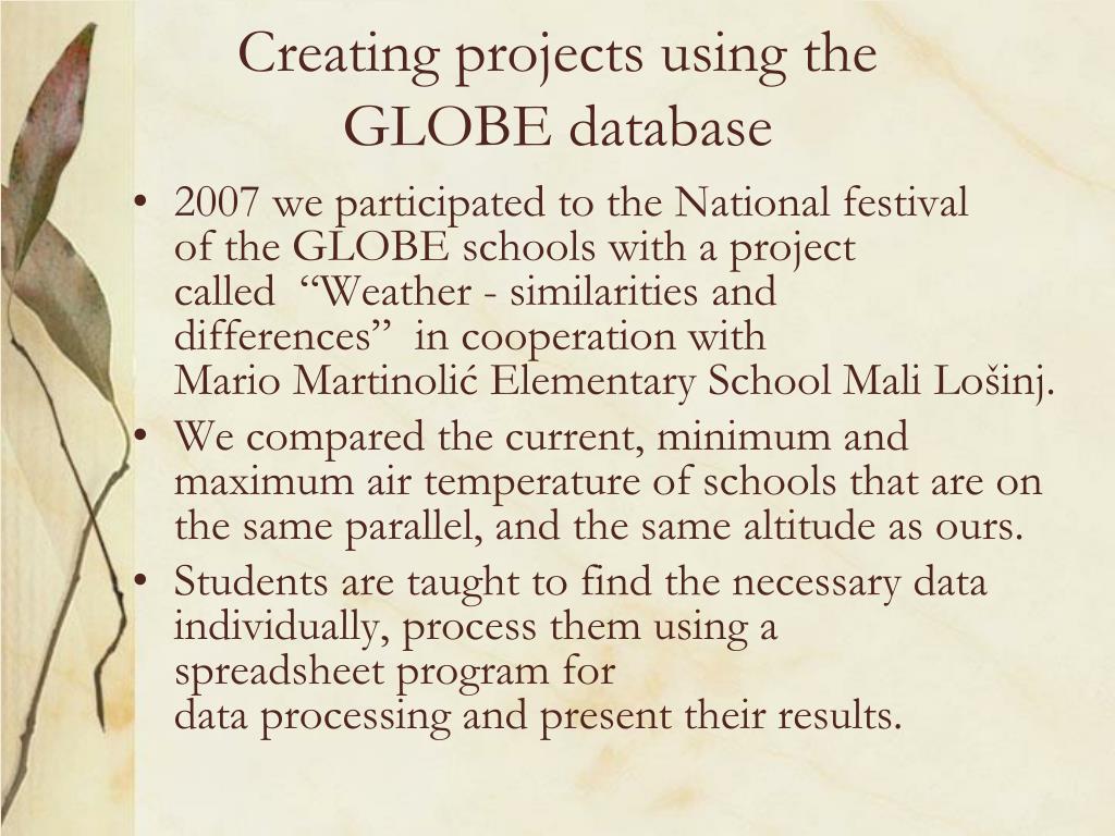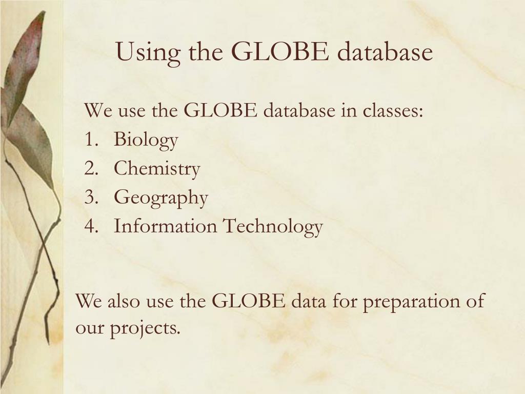 Usingthe GLOBE database We use the GLOBE databaseinclasses: • Biology • Chemistry • Geography • InformationTechnology Wealso use theGLOBE data for preparation of ourprojects.