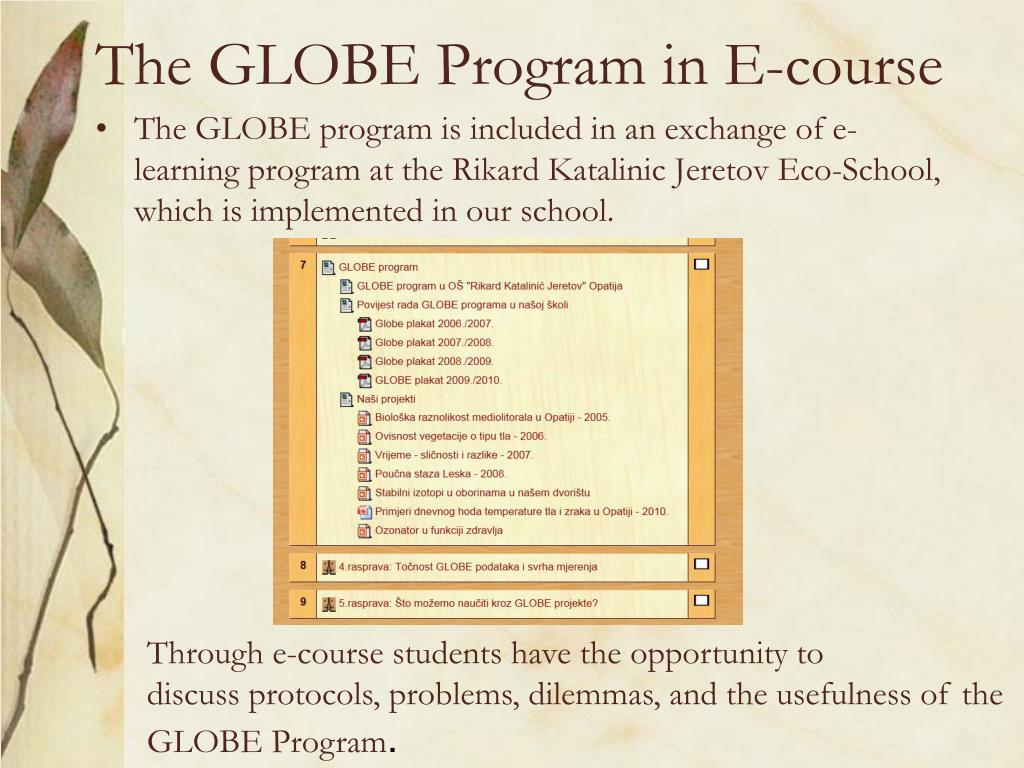 The GLOBE Program in E-course • The GLOBE program is included in an exchange of e-learning program at the RikardKatalinicJeretovEco-School, which is implemented in our school. Through e-course students have the opportunity to discuss protocols, problems,dilemmas, and the usefulness of the GLOBE Program.