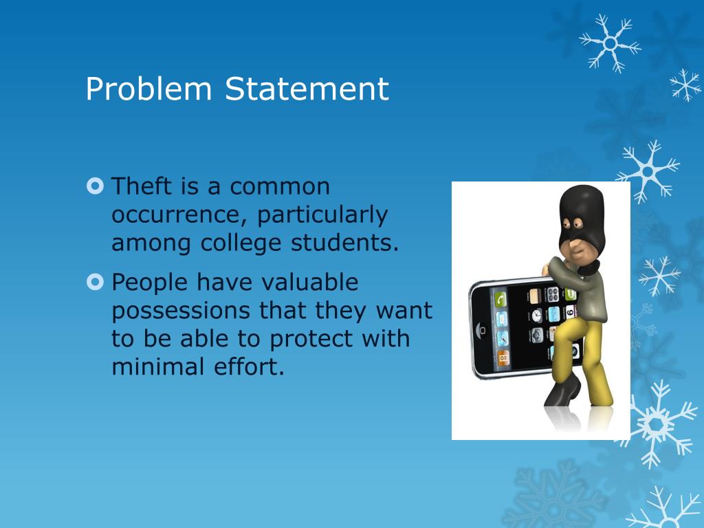 Problem Statement • Theft is a common occurrence, particularly among college students. • People have valuable possessions that they want to be able to protect with minimal effort.