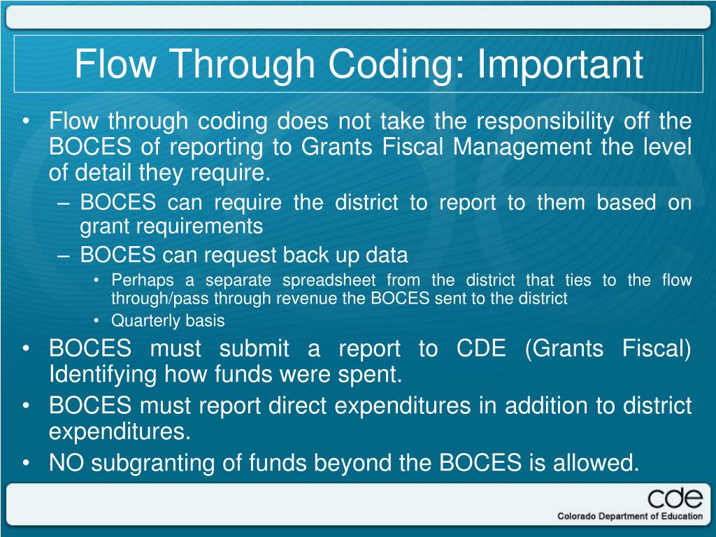 Flow through coding does not take the responsibility off the BOCES of reporting to Grants Fiscal Management the level of detail they require. BOCES can require the district to report to them based on grant requirements BOCES can request back up data Perhaps a separate spreadsheet from the district that ties to the flow through/pass through revenue the BOCES sent to the district Quarterly basis BOCES must submit a report to CDE (Grants Fiscal) Identifying how funds were spent. BOCES must report direct expenditures in addition to district expenditures. NO subgranting of funds beyond the BOCES is allowed. Flow Through Coding: Important
